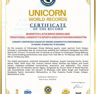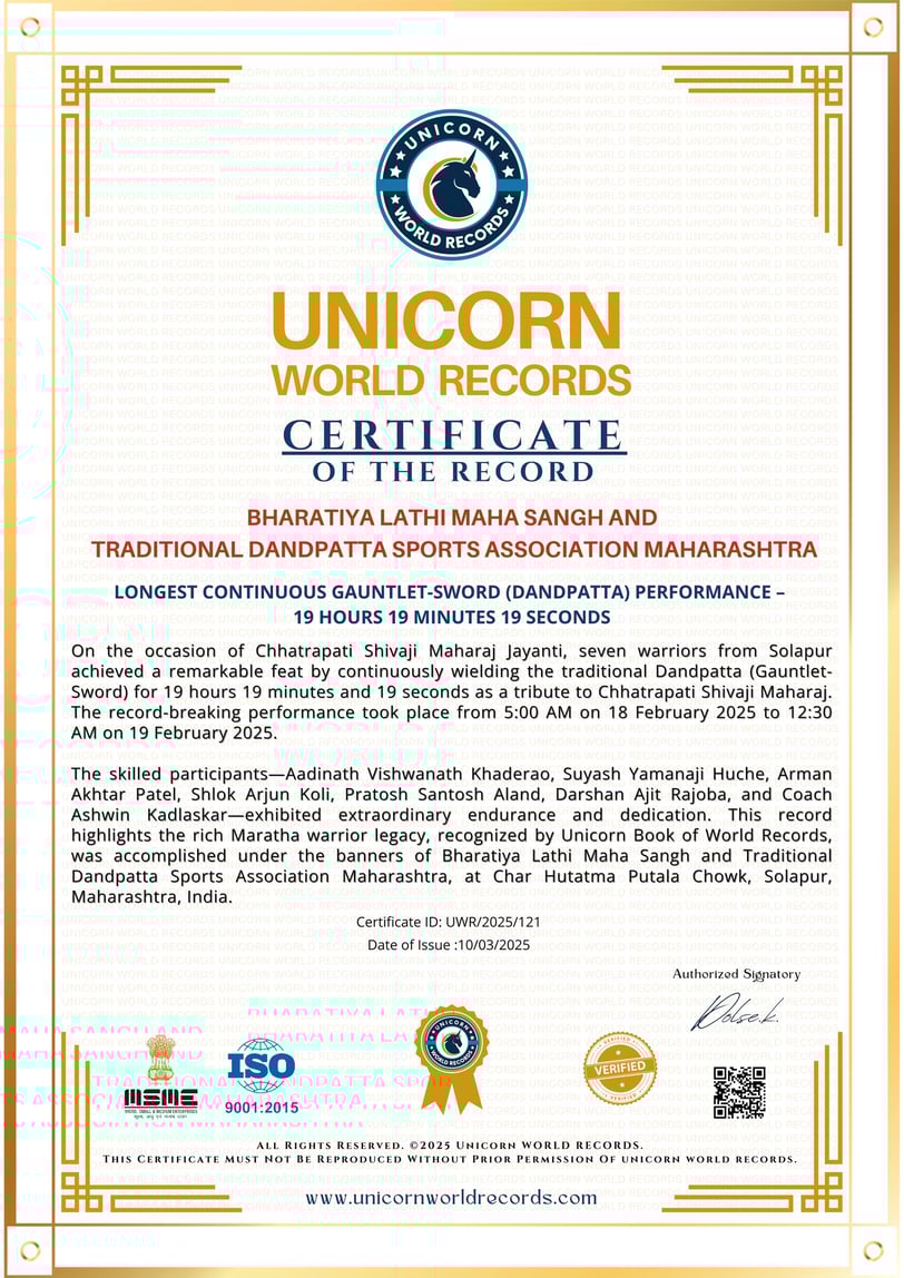 On the occasion of Chhatrapati Shivaji Maharaj Jayanti, seven warriors from Solapur achieved a remarkable feat by continuously wielding the traditional Dandpatta (Gauntlet-Sword) for 19 hours 19 minutes and 19 seconds as a tribute to Chhatrapati Shivaji Maharaj. The record-breaking performance took place from 5:00 AM on 18 February 2025 to 12:30 AM on 19 February 2025. The skilled participants—Aadinath Vishwanath Khaderao, Suyash Yamanaji Huche, Arman Akhtar Patel, Shlok Arjun Koli, Pratosh Santosh Aland, Darshan Ajit Rajoba, and Coach Ashwin Kadlaskar—exhibited extraordinary endurance and dedication. This record highlights the rich Maratha warrior legacy, recognized by Unicorn Book of World Records, was accomplished under the banners of Bharatiya Lathi Maha Sangh and Traditional Dandpatta Sports Association Maharashtra, at Char Hutatma Putala Chowk, Solapur, Maharashtra, India.
