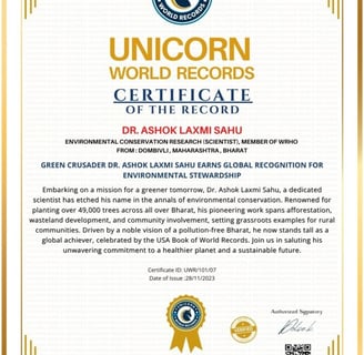 Embarking on a mission for a greener tomorrow, Dr. Ashok Laxmi Sahu, a dedicated scientist has etched his name in the annals of environmental conservation. Renowned for planting over 49,000 trees across all over Bharat, his pioneering work spans afforestation, wasteland development, and community involvement, setting grassroots examples for rural communities. Driven by a noble vision of a pollution-free Bharat, he now stands tall as a global achiever, celebrated by the USA Book of World Records. Join us in saluting his unwavering commitment to a healthier planet and a sustainable future.