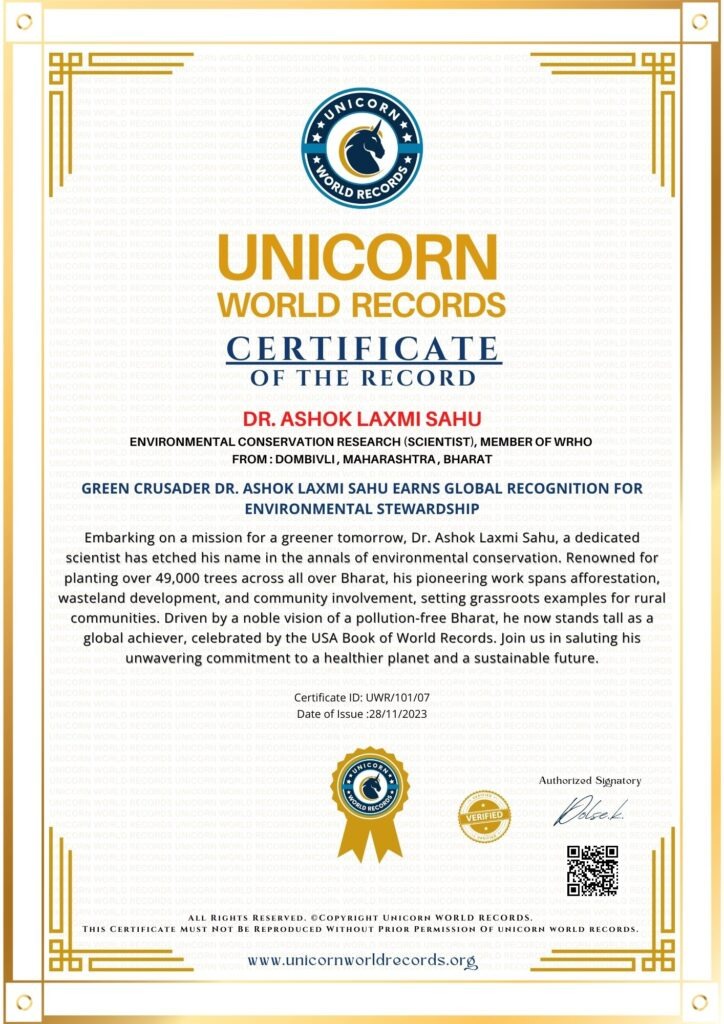 Dr. Ashok Laxmi Sahu Environmental Conservation Research (scientist), Member of WRHO From : Dombivli , Maharashtra , Bharat- Green Crusader Dr. Ashok Laxmi Sahu Earns Global Recognition for Environmental Stewardship