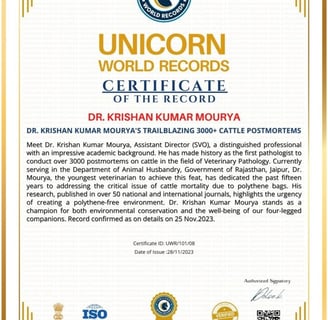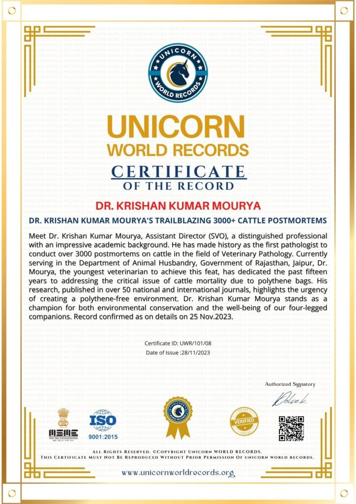 Meet Dr. Krishan Kumar Mourya, Assistant Director (SVO), a distinguished professional with an impressive academic background. He has made history as the first pathologist to conduct over 3000 postmortems on cattle in the field of Veterinary Pathology. Currently serving in the Department of Animal Husbandry, Government of Rajasthan, Jaipur, Dr. Mourya, the youngest veterinarian to achieve this feat, has dedicated the past fifteen years to addressing the critical issue of cattle mortality due to polythene bags. His research, published in over 50 national and international journals, highlights the urgency of creating a polythene-free environment. Dr. Krishan Kumar Mourya stands as a champion for both environmental conservation and the well-being of our four-legged companions. Record confirmed as on details on 25 Nov.2023.