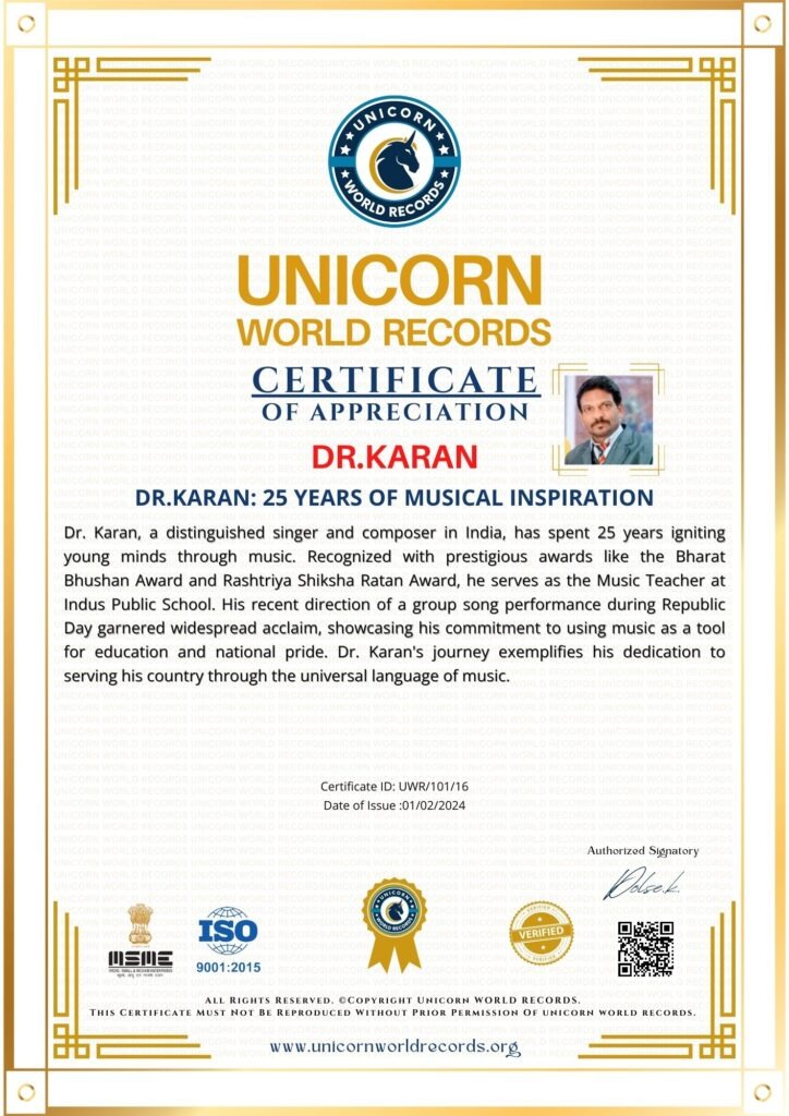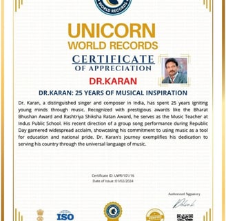 Dr. Karan, a distinguished singer and composer in India, has spent 25 years igniting young minds through music. Recognized with prestigious awards like the Bharat Bhushan Award and Rashtriya Shiksha Ratan Award, he serves as the Music Teacher at Indus Public School. His recent direction of a group song performance during Republic Day garnered widespread acclaim, showcasing his commitment to using music as a tool for education and national pride. Dr. Karan's journey exemplifies his dedication to serving his country through the universal language of music.