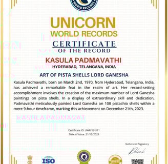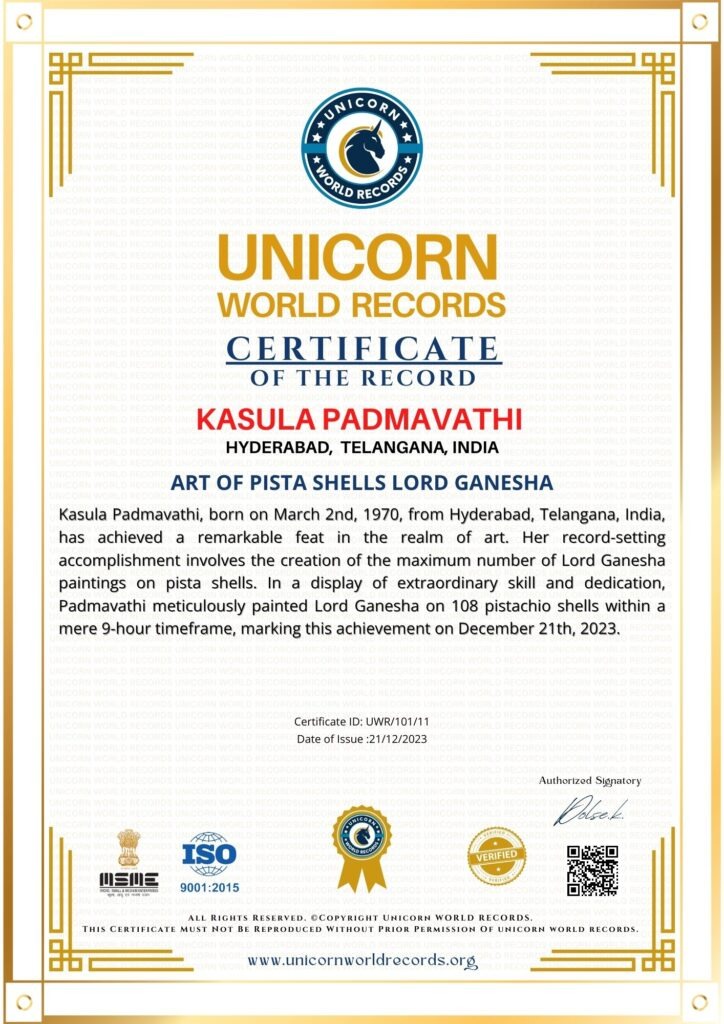 Kasula Padmavathi, born on March 2nd, 1970, from Hyderabad, Telangana, India, has achieved a remarkable feat in the realm of art. Her record-setting accomplishment involves the creation of the maximum number of Lord Ganesha paintings on pista shells. In a display of extraordinary skill and dedication, Padmavathi meticulously painted Lord Ganesha on 108 pistachio shells within a mere 9-hour timeframe, marking this achievement on December 21th, 2023.