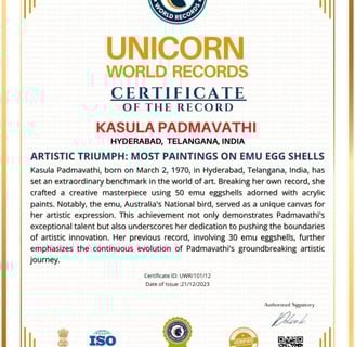 Kasula Padmavathi Hyderabad, Telangana, India -Artistic Triumph: Most Paintings on Emu Egg Shells