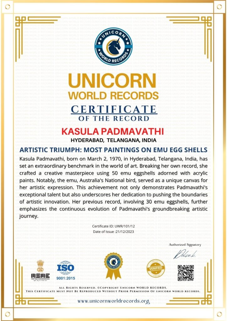 Kasula Padmavathi, born on March 2, 1970, in Hyderabad, Telangana, India, has set an extraordinary benchmark in the world of art. Breaking her own record, she crafted a creative masterpiece using 50 emu eggshells adorned with acrylic paints. Notably, the emu, Australia's National bird, served as a unique canvas for her artistic expression. This achievement not only demonstrates Padmavathi's exceptional talent but also underscores her dedication to pushing the boundaries of artistic innovation. Her previous record, involving 30 emu eggshells, further emphasizes the continuous evolution of Padmavathi's groundbreaking artistic journey.