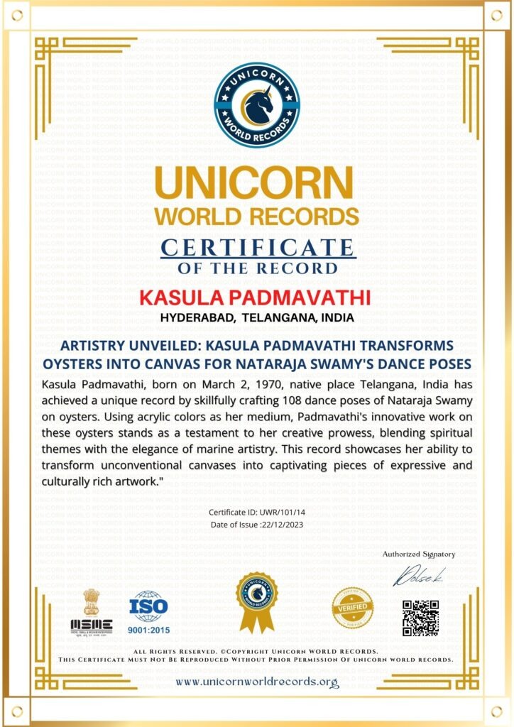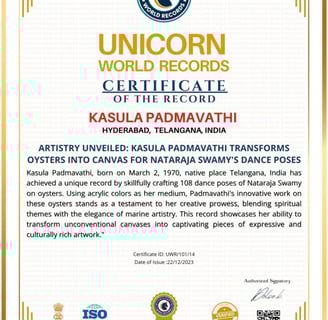Kasula Padmavathi, born on March 2, 1970, native place Telangana, India has achieved a unique record by skillfully crafting 108 dance poses of Nataraja Swamy on oysters. Using acrylic colors as her medium, Padmavathi's innovative work on these oysters stands as a testament to her creative prowess, blending spiritual themes with the elegance of marine artistry. This record showcases her ability to transform unconventional canvases into captivating pieces of expressive and culturally rich artwork."