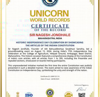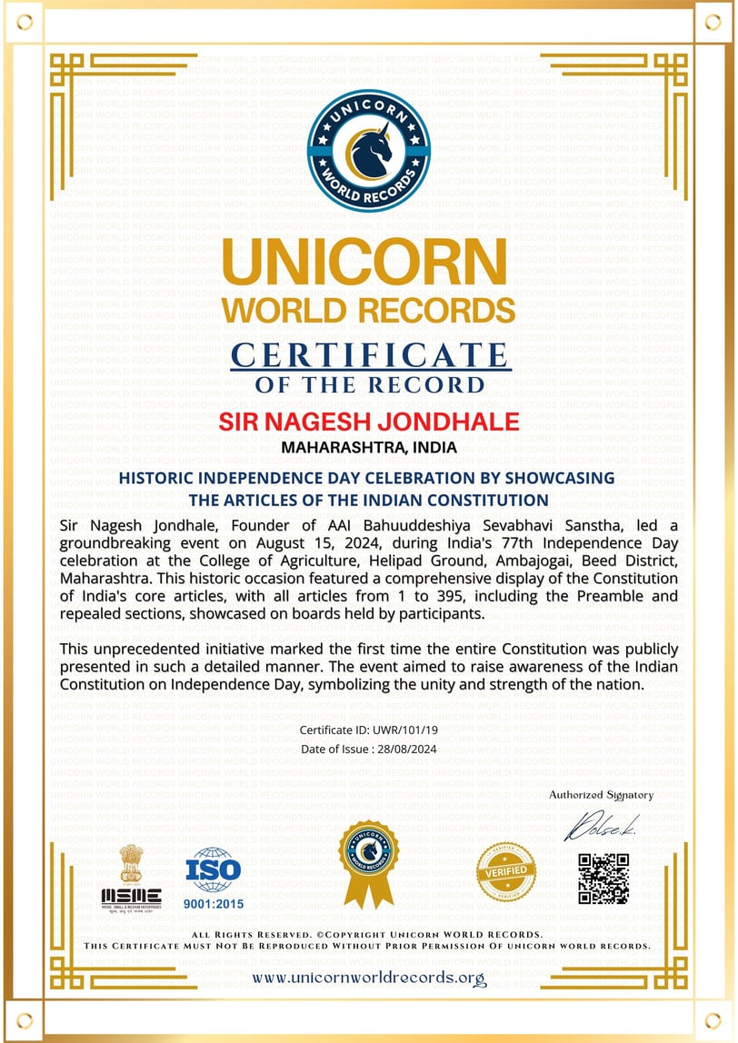Sir Nagesh Jondhale, Founder of AAI Bahuuddeshiya Sevabhavi Sanstha, led a groundbreaking event on August 15, 2024, during India's 77th Independence Day celebration at the College of Agriculture, Helipad Ground, Ambajogai, Beed District, Maharashtra. This historic occasion featured a comprehensive display of the Constitution of India's core articles, with all articles from 1 to 395, including the Preamble and repealed sections, showcased on boards held by participants. This unprecedented initiative marked the first time the entire Constitution was publicly presented in such a detailed manner. The event aimed to raise awareness of the Indian Constitution on Independence Day, symbolizing the unity and strength of the nation.