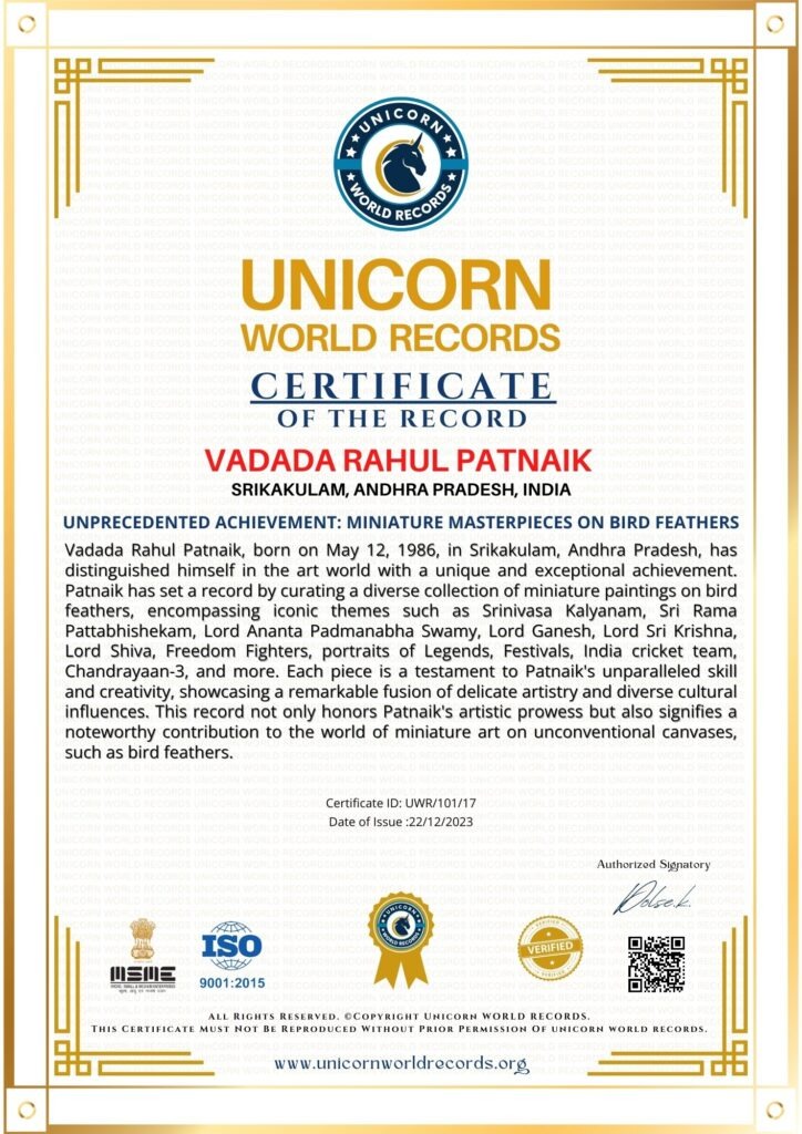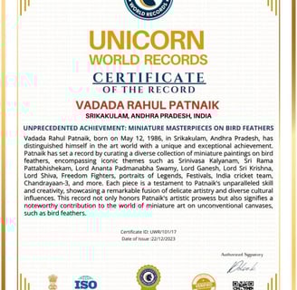 Vadada Rahul Patnaik, born on May 12, 1986, in Srikakulam, Andhra Pradesh, has distinguished himself in the art world with a unique and exceptional achievement. Patnaik has set a record by curating a diverse collection of miniature paintings on bird feathers, encompassing iconic themes such as Srinivasa Kalyanam, Sri Rama Pattabhishekam, Lord Ananta Padmanabha Swamy, Lord Ganesh, Lord Sri Krishna, Lord Shiva, Freedom Fighters, portraits of Legends, Festivals, India cricket team, Chandrayaan-3, and more. Each piece is a testament to Patnaik's unparalleled skill and creativity, showcasing a remarkable fusion of delicate artistry and diverse cultural influences. This record not only honors Patnaik's artistic prowess but also signifies a noteworthy contribution to the world of miniature art on unconventional canvases, such as bird feathers.